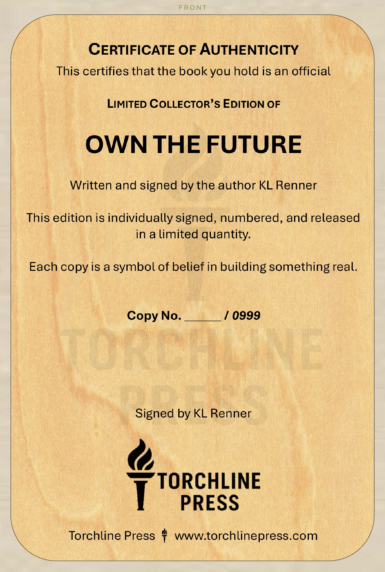 This one-time Limited Collector’s Edition of Own The Future is produced exclusively for KLRenner.com. Each copy is individually hand-signed and numbered. A Certificate of Authenticity is included. This edition features an exclusive author’s note and an additional chapter not included in the standard release. Once all 999 copies are sold, no further printings of this edition will be made.